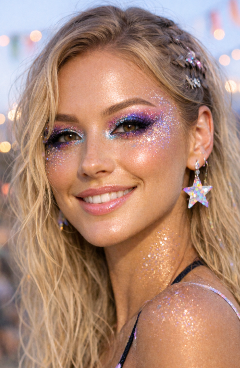 Een populaire keuze in 2026 is glitteroogschaduw. Deze oogschaduw geeft een intense glans en laat je ogen extra opvallen. Voor een nog dramatischer effect kun je chunky glitters gebruiken. Deze grotere glitters zorgen voor een speelse en creatieve uitstraling en geven je festivalmake-up extra glamour. Breng de glitter voorzichtig aan op je oogleden of rond je ogen. Een beetje glitter op de slapen of boven de jukbeenderen geeft je festivallook direct een opvallende sparkle.