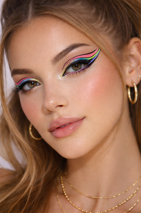 Denk bijvoorbeeld aan dubbele lijnen, geometrische vormen of een opvallende regenboogliner. Vooral felle kleuren zoals neonroze, felblauw en limegroen zijn populair dit seizoen. Deze kleurrijke lijnen geven je ogen meteen een speelse en energieke uitstraling en zorgen voor echte festivalvibes.