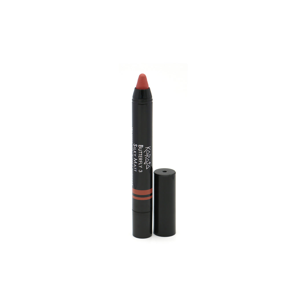 Butterfly Lipstick van Karaja is een matte lipstick in een groot twist-formaat. De crèmige lipstick glijdt tijdens het aanbrengen zijdezacht over de lippen voor een gelijkmatige dekking. Definieer de contouren van de lippen en geef ze meer volume met slechts één laagje.