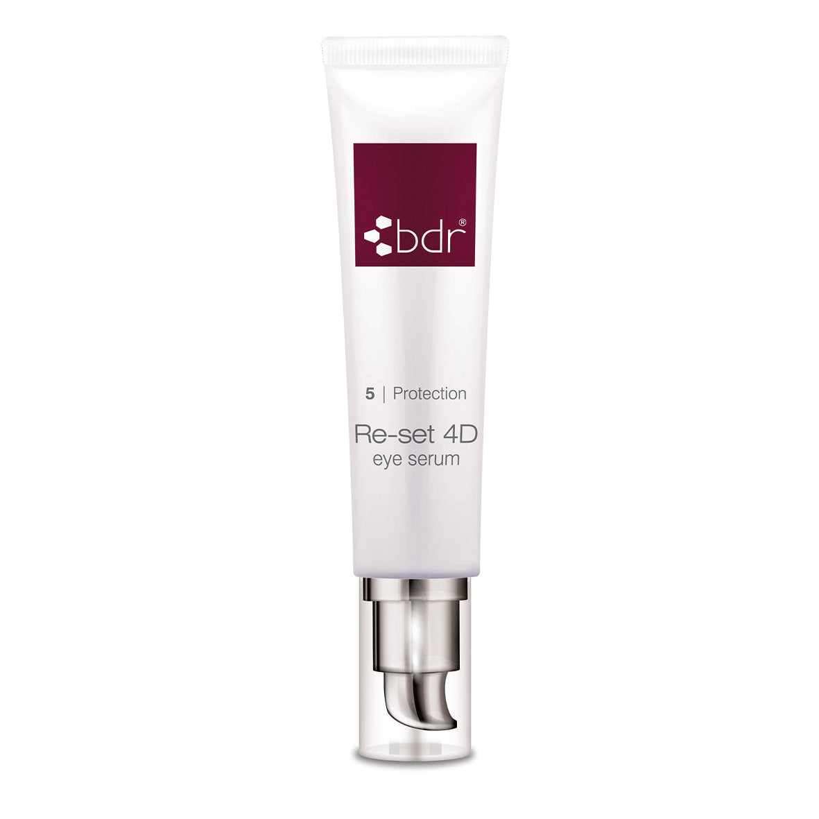 Breng Protection Re-set 4D Eye Serum van bdr twee keer per dag aan op de huid rond de ogen en lippen.